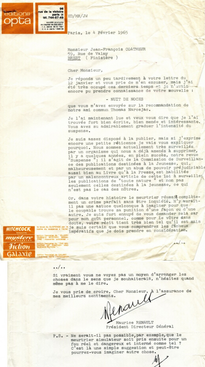 Courrier du 4 février 1965 de Maurice Renault expliquant les problèmes de censure relatifs à la fin peu « morale » de la nouvelle Nuit de noces »