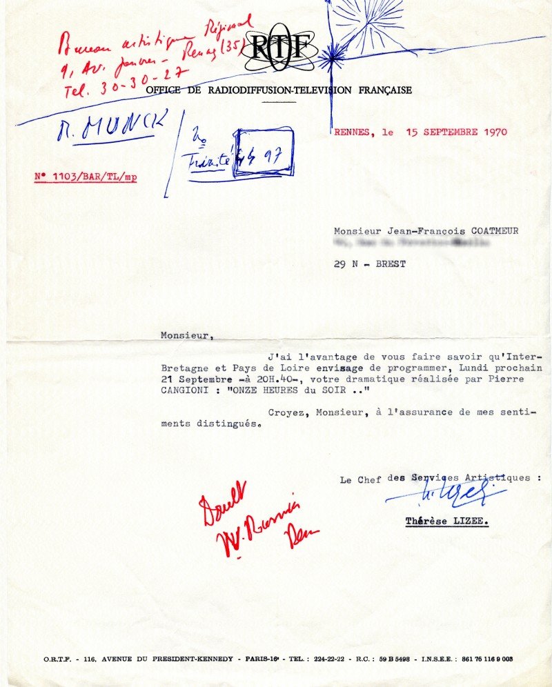 21 septembre 1971, diffusion de la dramatique radiophonique: « 11 h du soir » – ORTF Rennes