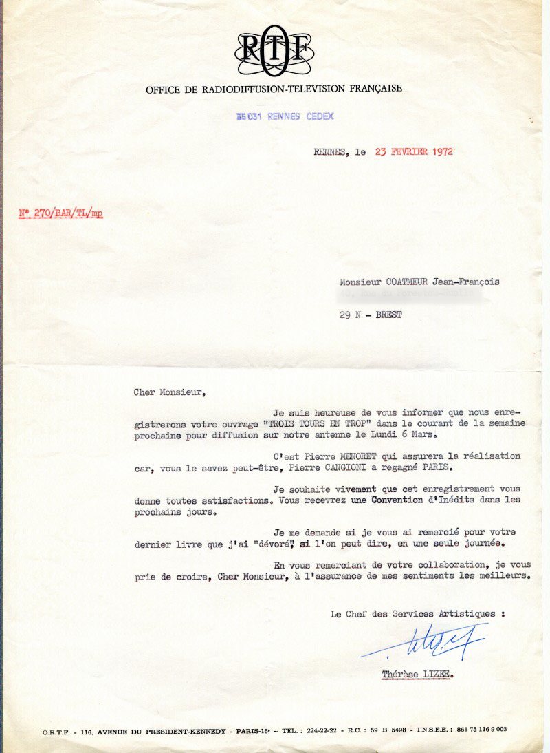 6 mars 1972, diffusion de la pièce radiophonique « Deux tours en trop » – ORTF Rennes