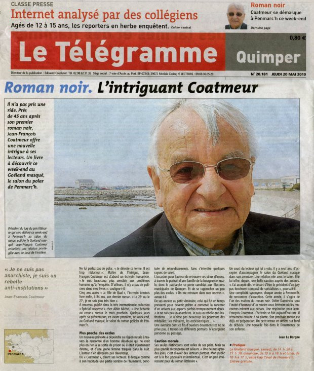 A l’occasion de la présentation de son nouveau roman « Une écharde au cœur » lors du salon du Goéland masqué, le quotidien Le télégramme lui consacre une pleine page